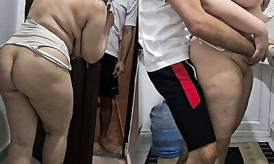 Stepmom is surprised by her stepson and jams her immense cock in the kitchen